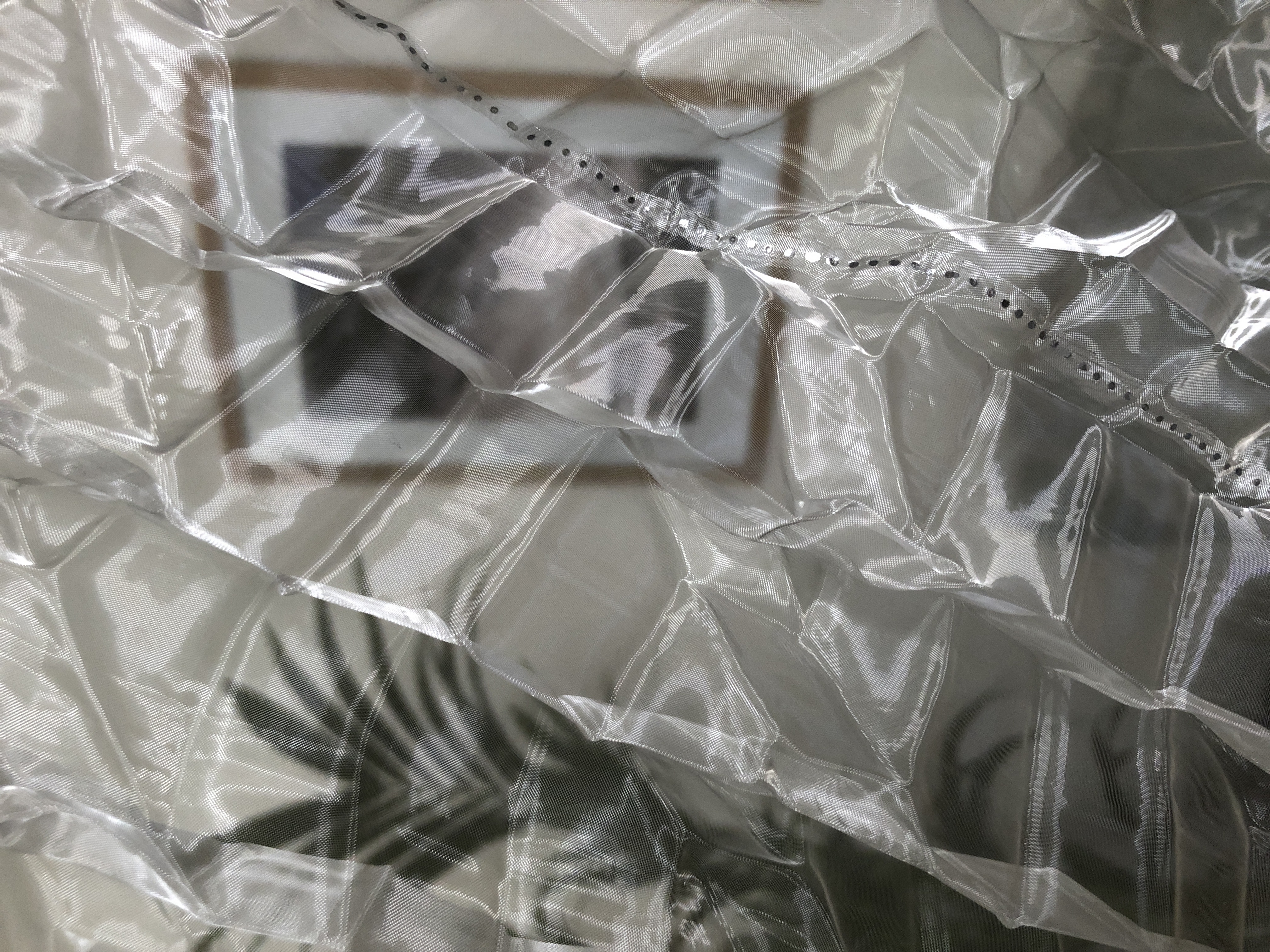 This process allows the fabric once pleated to create a three-dimensional structure of sensation and comfort. It allows air moving through and its own expression of form and texture. The thinness, lightness and durability together with the technique of the pleats allow the textile being transported easily from one place to another, because even rolled up, it will keep its pleats and remembers its form and shape. Its ephemeral yet permanent nature is therefore maintained and reinforced.